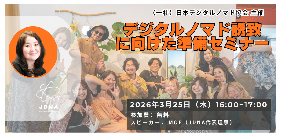 また、日本各地でデジタルノマド受入を検討している自治体・DMO・事業者を対象に、オンライン説明会「デジタルノマド誘致に向けた準備セミナー」を2026年3月25日(水)に開催します。